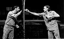 Murderers are especially difficult. Macbeth can elicit surprise in its ability to make one empathize with a murderer, and in Iphigenia at Aulis one is shocked to feel for the duplicitous King Agamemnon—who is about to kill his child. Dead Man Walking made many feel the barbarism of the state execution of a murderer, but only Truman Capote’s In Cold Blood has truly moved me in this regard. The recent introduction of DNA evidence, and the wrongful convictions of people to death row, has complicated matters and put many of us on the fence. And now there is playwright Bruce Graham. His new play, at least just after its performance in the BTF’s intimate Unicorn Theater, doesn’t allow one to easily sit on the fence regarding one’s attitude toward the death penalty. Those against capital punishment will feel championed; those in favor will be forced to reevaluate its conditions. And the masses who equivocate will find their notions of evil and retribution challenged. This is a compelling play of ideas and emotions that makes one bristle one moment, laugh the next, and, in a very special scene, swallow hard. Or possibly choke. Jessica Wade’s canny scenic design of two adjacent cells on death row daringly distances us from the inmates whose lives we will share for about 90 swift and mercifully unbroken minutes. Although the bars are cut away in places so that we can be afforded unobscured views of the men’s faces, we often see them partially obscured, and the very jaggedness of the broken bars serves to confer an extra degree of harshness or toughness to the men. The inmates are John Brennan (Michael Waelter) and Bobby Reyburn (Greg Keller). Brennan, who claims he is innocent, has earned the contempt of the prison administration through his articles and obituaries of executed men in the prison newspaper that he edits, and which has attracted the attention of national media. Brennan is an intellectual who has been able to find the humanity in every man no matter what his crimes. His ability is put to the test when Reyburn is transferred to the cell just vacated by an African-American whose execution has left Brennan particularly embittered. Reyburn, a member of a white supremacist group, hates Jews and blacks, and has earned his place on death row for mass murder in which 37 people, 14 of them being children, were burned alive in a church. Unrepentant, Reyburn claims he was doing God’s work. Long-haired and with his body covered in tattoos, Reyburn amuses himself by doing impressions of animals. We in the audience are, despite ourselves, amused; Brennan is not. James Warwick’s tight direction of Graham’s unsparing dialogue and powerful performances by Waelter and, particularly, Keller may well leave you stunned. How they manage this doesn’t seem quite fair to reveal. Suffice to say, the manipulation is done truthfully and earnestly, and my admiration for the sizable accomplishment is not grudging. This is one of the most important plays the summer season is likely to produce. —R.H.